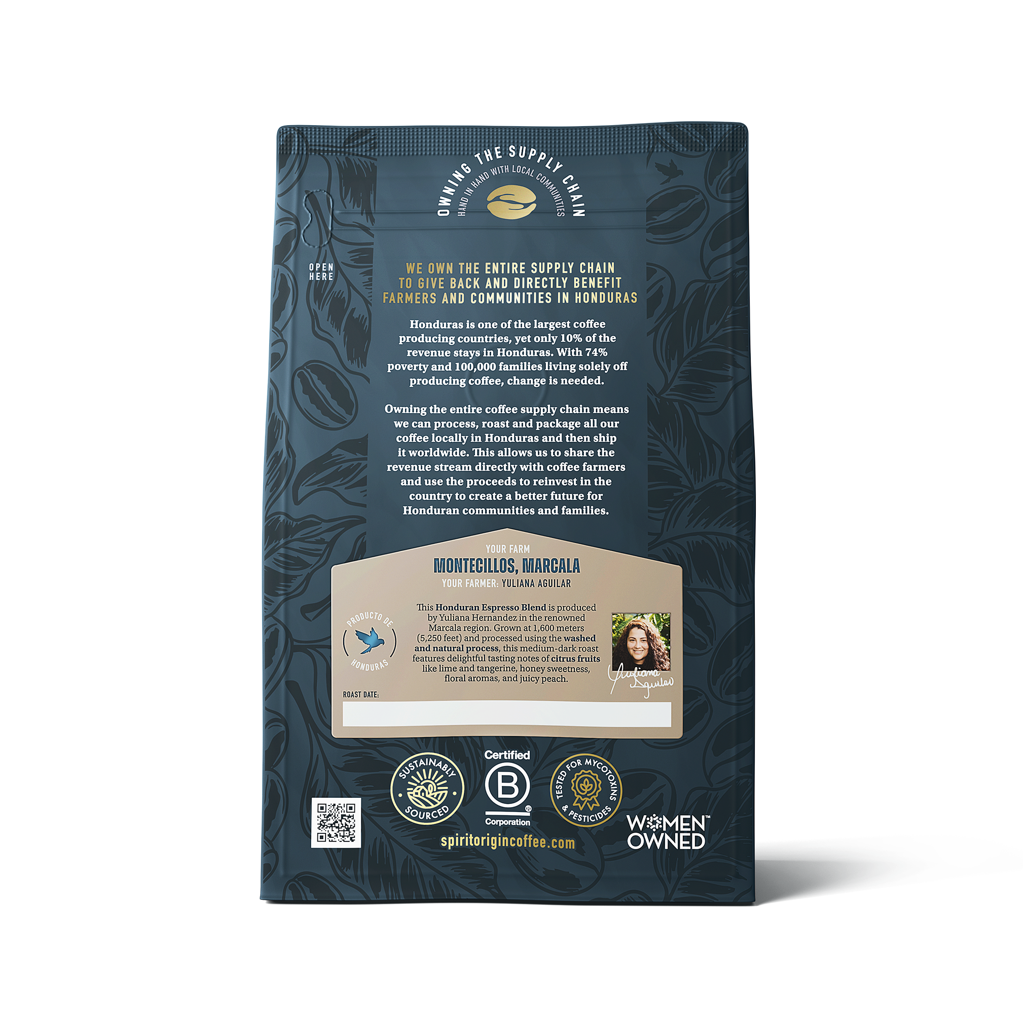 Joining two Honduran beans from Finca Montecillos, this medium-dark roast has tasting notes of citrus, honey, sweet fruit, floral, and peach. You won't find a better cup of espresso. Enjoy the delightful flavor grown with love by Yuliana Hernandez and made into perfection by our skilled in-house roasters.